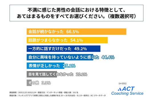 次に、「不満に感じた男性の会話における特徴」を尋ねる設問の回答では、1位が「会話が続かなかった」で66.5%、2位が「話題がつまらなかった」で54.1%、3位が「一方的に話すだけだった」で49.2%という結果になりました。この結果から、会話自体が続かないことや、話題がつまらないことに不満を感じた人が多い、ということがわかりました。