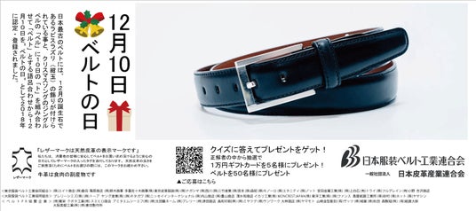 ベルトの日(12月10日)は、奈良の正倉院に収蔵されている日本最古のベルトの本体に紺玉の飾りが付けられており、紺玉は12月の誕生石のラピスラズリのことなので12月。12月に流れるクリスマスソングの「ジングルベル」の「ベル」に、10日の「ト」を組み合わせて「ベルト」とする語呂合わせから。実用性、ファッション性、そしてギフト製品としても需要の高いベルトの良さをアピールすることが目的。記念日は2018年(平成30年)に一般社団法人・日本記念日協会により認定・登録されました。