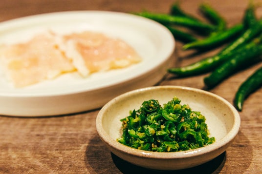 やみつき青唐辛子 200円 爽やかで鮮烈な辛味がホルモンの旨みを引き出す薬味です。ホルモンだけでなく霜降りのお肉とも相性抜群です。