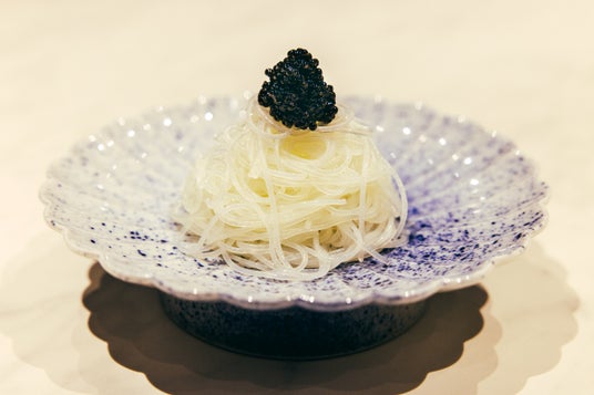 シェフが趣向を凝らした季節のビーフン。手間暇を惜しまず厳選素材で仕込んだ自家製“鶏湯(チータン)”をベースに、黒い宝石“キャビア”をあしらいました。濃厚な鶏の旨みとキャビアの塩みが絶妙に調和する前菜です。