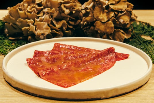 サシと赤身のバランスが良い極上ロースの芯を京味噌の特製ダレで焼き上げ、炙った舞茸を巻いて仕上げます。味噌の程よい甘さに全体を引き締める出汁醤油の香ばしさ、舞茸の魅力的な旨みをご堪能ください。