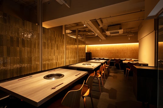 無煙ロースターがついたテーブルはゆったりと配置され、デートや女子会などにもぴったりです。半個室もありファミリーやご接待などさまざまなシチュエーションでご利用いただけます。アラカルトでお好みを選んでいただくもよし、3種類のコース(¥6,800/¥9,000/¥12,000)(前日までの要予約)で牛肉のいろいろな味わいを楽しむのもよし、他にも宴会プランやアニバーサリープランなども登場する予定です。