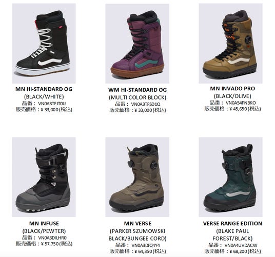 そのほかにも、VANSスノーのもっともアイコニックなモデル「HI-STANDARD OG」や、ダブルBOA(R)フィットシステムを搭載したハイエンドモデル「VERSE」のニューカラーなど、豊富なラインアップで展開しています。
