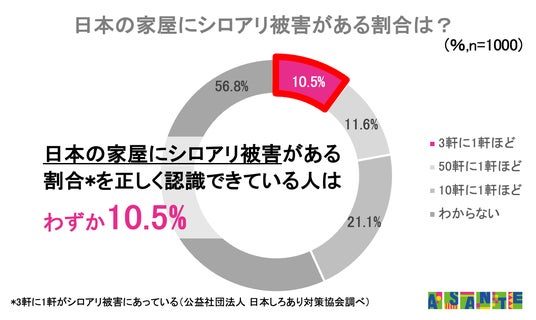 - 日本の家屋にシロアリ被害がある割合は約3軒に1軒だが、正しく回答できた人の割合は10.5%にとどまった