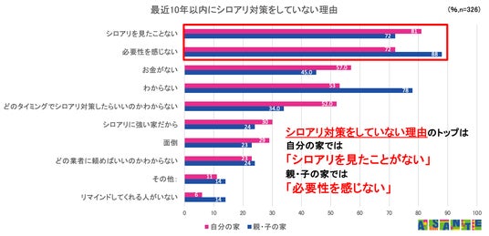 - 10年以上シロアリ対策をしていない理由としては「シロアリを見たことがない」続いて「必要性を感じない」「お金がない」を選択した人が多かった。離れて暮らす親や子どもの立場では、自身の時と同様に、「必要性を感じない」と「シロアリを見たことがない」に加え、「(親・子の状況が)わからない」を選択した人が多かった