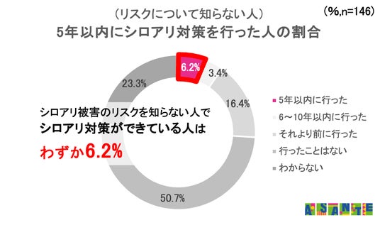 - 一方、家屋(一軒家)がシロアリの被害にあっていると、地震の際に倒壊リスクが高くなることを知らないと回答した人(146名)では、「5年以内のシロアリ対策」ができている人はわずか6.2%だった