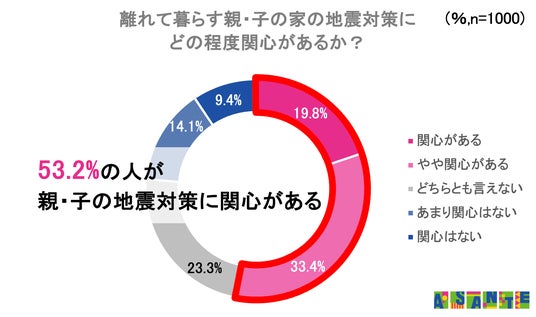 - 離れて暮らす親や子どもの地震対策について半数以上の53.2%が気にかけているが、家屋の耐震性について親子で話したことがある人は4人に1人(25.2%)