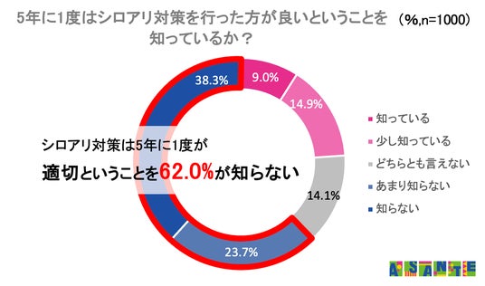 - 家屋(一軒家)の防蟻(シロアリ)対策の有効期限は5年で、5年に1度は対策を行った方が良いということを知っている人は23.9%にとどまる