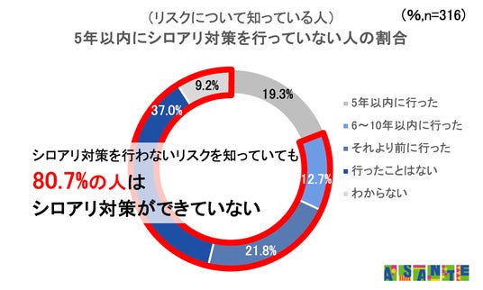3、家屋(一軒家※)がシロアリの被害にあっていると、地震の際に倒壊リスクが高くなることを知っていると回答した人(316名)の中でも、適切な対応とされる「5年以内のシロアリ対策」ができていない人は80.7%だった ※一軒家は賃貸も含む