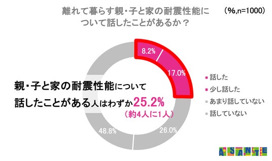 1、離れて暮らす親や子どもの地震対策について半数以上の53.2%が気にかけているが、家屋の耐震性について親子で話したことがある人は4人に1人(25.2%)