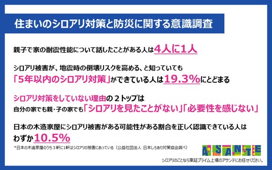 【住まいのシロアリ対策と防災に関する意識調査】家屋の地震対策について親子で話したことがある人は4人に1人* シロアリ対策が地震対策に有効と知りながら対策している人はわずか19.3%という結果も…