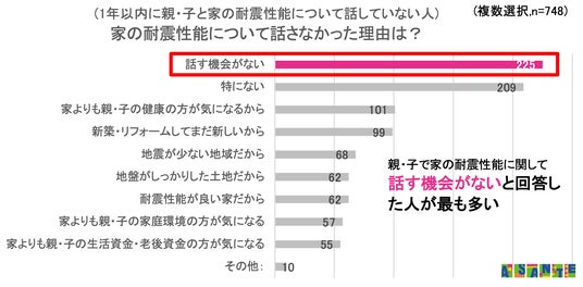 - 家屋の耐震性に関して、1年以内に親子で話をしていない理由として最も多いのは「話す機会がない」こと。続いて「特に理由はない」「家屋の耐震性よりも健康が気になる」が続いた。話すきっかけとしては「災害に関する報道を見た」「心配だから」の順で多く選択されている