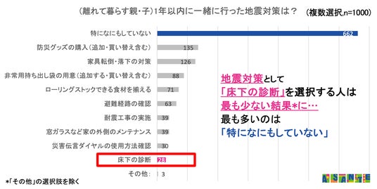 調査結果1で、実に半数以上の人が、離れて暮らしている親や子どもの地震対策について関心を示していたものの、直近1年間で何か対応をした人は少なく、床下の診断をした人は最も少ない結果となりました。
