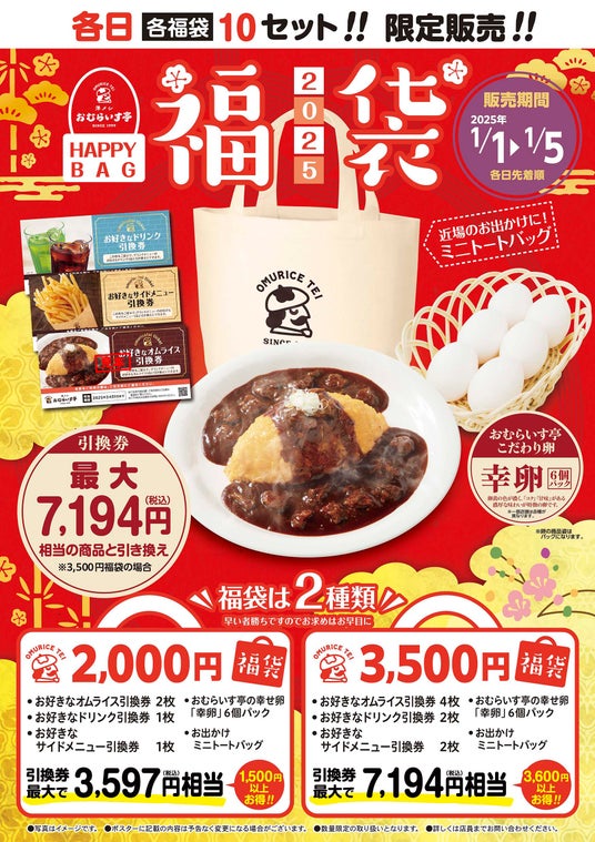 本年も残り少なくなりました。今年一年のご愛顧に「おむらいす亭」スタッフ一同感謝を申し上げます。そして2025年・元日より1月5日(日)まで各日 2種類の「福袋(フードコート・バージョン)」を各10セット(合計20セット)販売いたします。内容はおむらいす亭こだわりの卵「幸卵」6個パックに特製ミニトートバッグ、そしてオムライス・ドリンク・サイドメニュー、それぞれの引換券でございます。早い者勝ちですのでお求めはお早めにお願いいたします。新春より皆さまのご来店をスタッフ一同お待ちしております。※福袋販売フードコート実施店舗は下記に記載させていただきます。