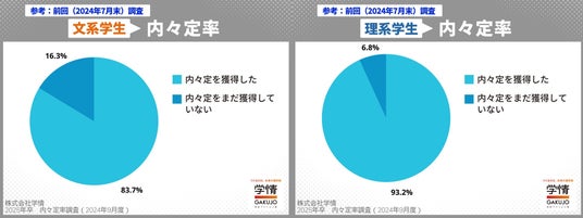 株式会社学情(本社:東京都中央区)は、2025年3月卒業(修了)予定の大学生・大学院生を対象に、就職活動に関するインターネットアンケートを実施。今回は、「内々定の獲得状況」をテーマに調査しました。2024年8月末時点の内々定獲得率は「91.2%」。内定式を1ヵ月後に控え、内々定率が9割を超えました。文理別では、文系が「90.0%」で、前月比6.3ポイント増と大きく伸びたのが目立ちます。一方、理系は「93.6%」で、前月比0.4ポイントの微増でした。また、「内定(内々定)を獲得し、就活を終了した」と回答した学生は「78.0%」と、約8割の学生がすでに就職活動を終えていることがわかります。