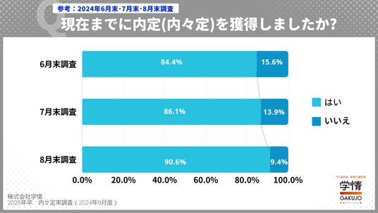 2024年8月末時点の内々定獲得率は「91.2%」、ついに9割を超える内々定率となりました。8月度調査では前月から2.1ポイントの伸びでしたが、前月比4.4ポイント増と大きく伸長しています。また、昨年同時期調査の「90.6%」と比較しても0.6ポイント増加しています。