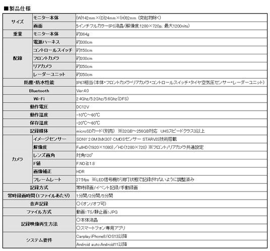 現在他社にて販売されている同等品の殆どは「屋内のみ使用可能」のTELEC認証しか受けておらず、屋外で使用すると罰則が当たる恐れがありますが、本製品のBluetooth機能・Wi-Fi機能・タイヤ空気圧監視機能・ミリ波レーダーによる運転支援機能の全てにおいて日本国内でのTELEC認証をクリアしています。