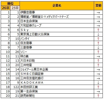2026卒・就職ブランド調査[早期]:伊藤忠3年連続1位、商社・金融・IT安定人気、学生の安定志向強まる