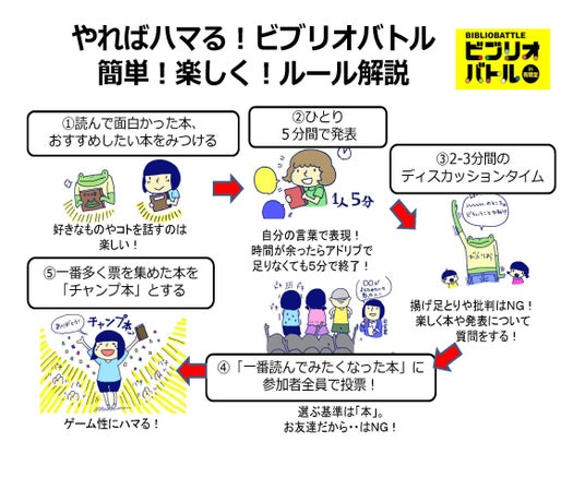 ビブリオバトルとは、バトラーと呼ばれる本の紹介参加者が交代でおすすめの本を紹介し、全員の紹介が終わったら観覧者も含めて読みたくなった本に投票し、一番票を集めた「チャンプ本」を決めるゲームです。