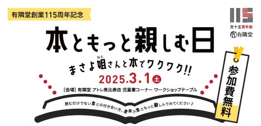 株式会社有隣堂(本社:神奈川県横浜市 代表取締役 社長執行役員:松信健太郎)は、2025年3月1日(土)、有隣堂 アトレ恵比寿店(東京都渋谷区)にて、「本ともっと親しむ日~子どもも大人も まさよ姐さんと本でワクワク!!~」と題した、書店員みずからがプロデュースする地域交流イベントを開催いたします。本企画は、2024年12月に創業115周年を迎えた当社の記念事業の一環として、読書文化の振興を通して地域活性化に貢献することを目指した取り組みです。