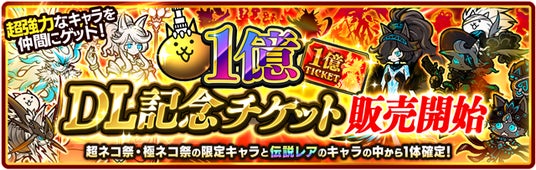 下記期間中、ネコカン600個に加え、専用のレアガチャ「1億DL記念ガチャ」で使える「1億DL記念チケット」がセットで登場!