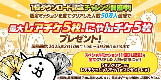 1億ダウンロード記念ミッションを全てクリアしたユーザの人数によって、最大レアチケ5枚とにゃんチケ5枚をプレゼントするチャレンジイベントが登場!