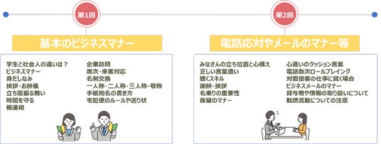 本研修は、「ポータブル研修」「マナー研修」「はたらき方研修」の大きく3つから構成されており、1プログラムにつき60~75分を目安に、ゲーム感覚で取り組める課題を盛り込むなど、専門学校ごとに実施時期や内容をカスタマイズしています。なお、研修はキャリアコンサルタント資格を持つ講師が担当します。