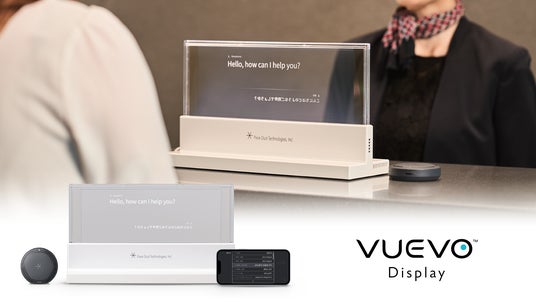 「VUEVO Display」は、「VUEVO」で培った技術と多言語翻訳機能・透明ディスプレイを組み合わせ、会話の字幕をリアルタイムで透明ディスプレイの両面に表示することができます。聴覚障がい者/難聴者との会話・外国語での会話、どちらの場面においても相手のジェスチャーや表情を見ながら、自然な対面コミュニケーションを実現できます。