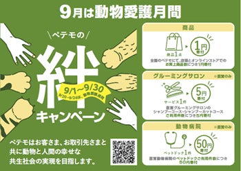 イオンペット株式会社(代表取締役社長:米津一郎、以下イオンペット)は、9月20日(金)~9月26日(木)の動物愛護週間※に伴い、9月1日(日)~9月30日(月)の期間中、『絆キャンペーン』を実施します。