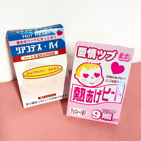 BOX入りチョコは「熱あげヒート」「リアコデス・ハイ」の2種展開で、プチギフトにするとインパクトを残せそうなデザインです。