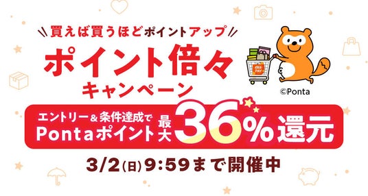 ポイント倍々キャンペーンは、購入商品数や条件に応じて購入総額の最大7%のPontaポイント(au PAY マーケット限定)を還元します。買い得メンバーズの特典と店舗からのポイント還元をあわせて、最大36%のポイント還元となり、au PAY マーケットでのお買い物がおトクにお楽しみいただけます。
