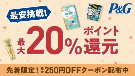 さらに今回のポイント倍々キャンペーンでは、P&Gの各種ブランド商品をご購入いただくと、最大20%のポイントを還元します。そのほかPontaパス会員限定で、日用品からヘアケア、ベビー用品などP&Gの商品がおトクにご購入いただける割引クーポンを配布します。