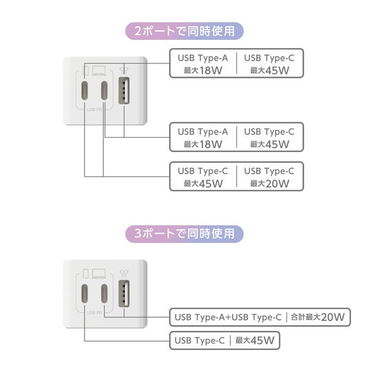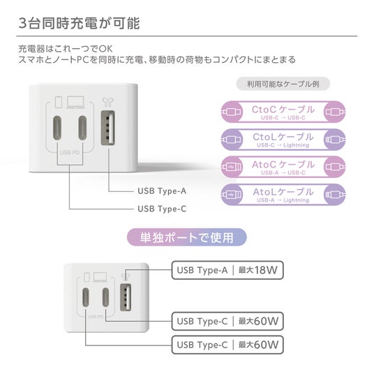 製品本体に、USB Type-Cが2ポートとUSB Type-Aポートを1ポート搭載することで、3台同時に充電が可能。お手持ちのType-CケーブルやUSB-Aケーブルも使用でき、時短で仕事や勉強の効率化にも最適です。コンセント周りもスッキリし、持ち歩きにも便利。