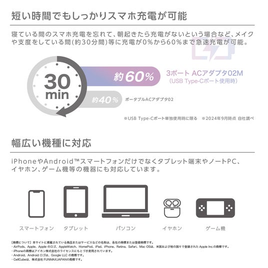 株式会社 FUNMAXJAPAN(本社:東京都台東区、代表取締役:深谷 信男)は、「docomo select」におけるCELLCUBE製品の取り扱い第3弾として急速充電対応のコンパクトかつパワフルな3ポートACアダプタ02Mを2024年10月下旬より全国のドコモショップ及びドコモオンラインショップにて、販売いたします。