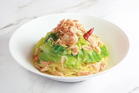 柔らかく甘い春キャベツと釜揚げ桜えびをアンチョビソースで仕上げました。