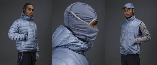 薄手のナイロンリップストップベストや流線型のダウンジャケットなどのセカンダリー・レイヤーは、必要以上のかさばりを抑えながら保温性を提供。アクセサリーはマイクロフリースのグローブ、スキーマスク、ナイロンとメッシュのテープシームキャップなど、多目的に着用できるミニマルなデザインに仕上げ、コレクションを完成させています。
