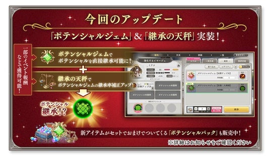 2025年1月24日(金)実施のメンテナンスにて、新規アイテム「「ポテンシャルジェム」および「継承の天秤【ポテンシャルジェム】」を実装いたしました。