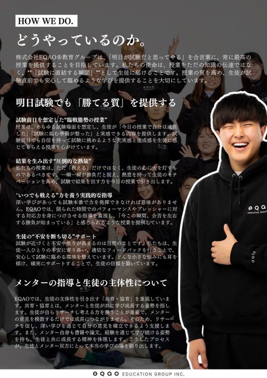 株式会社EQAO(R)教育グループは、「明日が試験だと思ってやる」をモットーに、最高の授業を提供することを目指しています。私たちは授業を単なる知識の伝達ではなく、**「試験に直結する瞬間」**と捉え、生徒が試験直前でも安心して臨めるようサポートします。