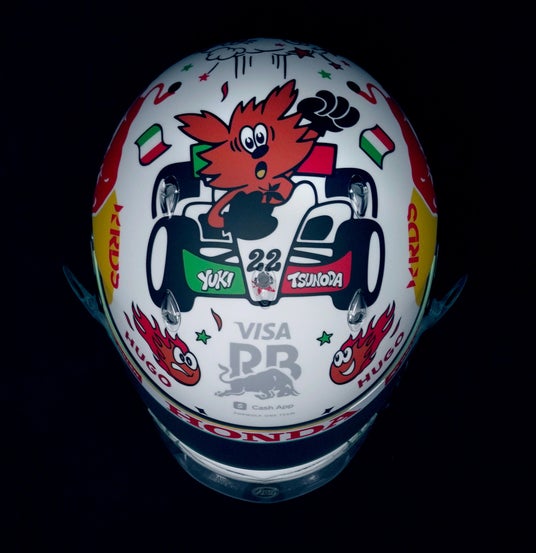 角田裕毅のオリジナルキャラクターが誕生し、さらにイタリアGP仕様に描かれたヘルメットです。ヘルメットの側頭部にRDSのロゴを掲載してレースに臨みます。