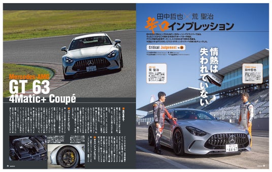 田中哲也と荒聖治、いずれも当代一流のレーシングドライバーである。そんな2人だからこそ語れるスポーツカーの性能。テストの場所は鈴鹿サーキット。ここを走らせて素性を見破る。今回はメルセデスAMG GT 63 4マティック+ クーペの実力をチェックした。
