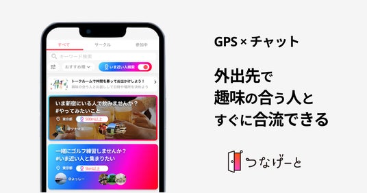 GPSとチャットルームを連携し、いま近くにいる人と合流してすぐに趣味を楽しめる「いま近い人検索」機能をリリース! 友達マッチングのコミュニティアプリ「つなげーと」