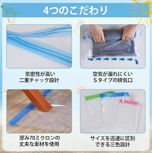 この圧縮袋は、柔軟性と耐久性に優れたPA+PE素材を使用しており、従来品よりも1.5倍の厚みで、破れにくく何度でも繰り返し使えます。さらに、二重チャック構造を採用しており、真空状態を維持し、湿気やほこり、カビやダニから衣類を保護します。大切な衣類を長期間清潔で新鮮な状態に保つことが可能です。