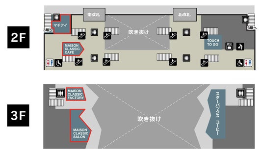 2F 改札内1ショップ・改札外1ショップ / 3F 改札外2ショップ