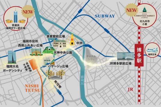 2020年からスタートした「ナカスキボウノヒカリ」は昨年「ナカス ヒカリノ アドベント」と改称し、5年目の今年は中洲中央通り、那珂川通り、明治通り、福博であい橋の中洲地区を、きらびやかなイルミネーションで照らします。清流公園の屋台が並ぶ川沿いまでライトアップが続き、橋の上からの景色は見ものです。同日から博多、13日(水) 貴賓館前広場、14日(木)天神中央公園、そして16日(土) 天神と各会場がつながります。