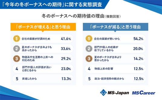 また、ボーナス額の増減予想とその理由についても調査を実施したところ、「増える」予想派も、「減る」予想派も、どちらも1位には「会社の業績」がランクインしました。