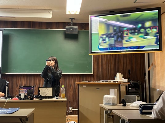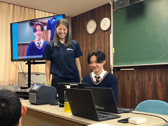 当日は、高校1年生及び2年生の36名が参加し、富士東高等学校の教室でNECの中核技術の1つで世界トップクラスの高精度な顔認証技術や、AIと連携したカメラによる人検知に関して、クイズやデモンストレーションを通して体験。そのほかNECグループのDX活用事例やDX人材になるために必要な知識や資格の紹介を行っています。