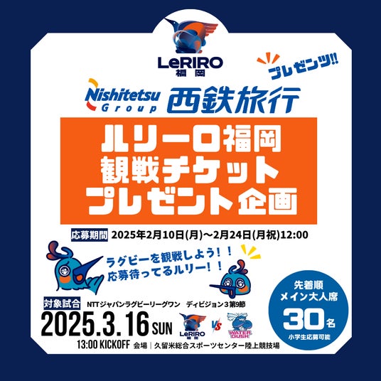 NTTジャパンラグビー リーグワン所属・ルリーロ福岡【西鉄旅行株式会社様presents】 第9節クリタウォーターガッシュ昭島戦へ30名様を無料ご招待!