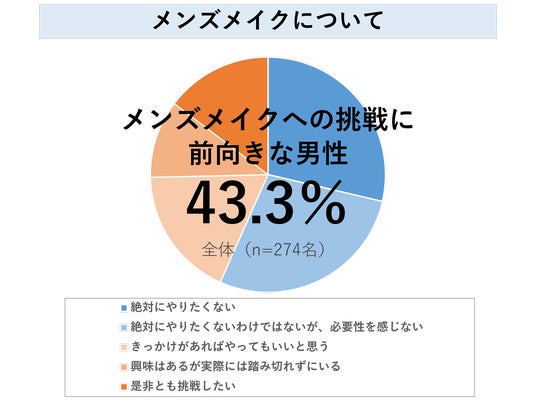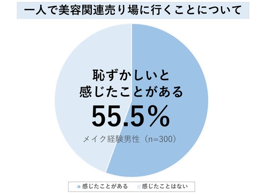 20~30代の男性を対象に「メンズメイク」について調査したところ、全体の40%以上の男性が「メンズメイクや美容にチャレンジしてみたい」と回答し、男性の間で関心が高まっていることがわかります。その一方で「メンズメイクの売場に行ったことがない」男性が半数以上を占めるなど、関心度に対して男性自身とメイクとの距離が感じられます。