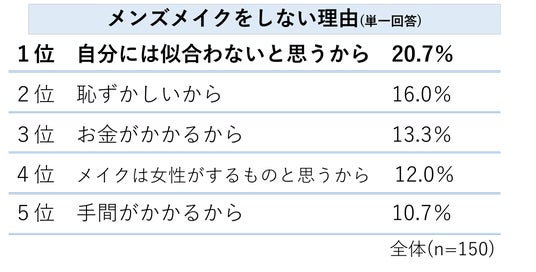 メイクをやらない(やりたくない)理由としては、「自分には似合わないと思うから(20.7%)」と自分自身がメイクをするイメージが湧きにくいという声が最も多く挙がりました。一方で挑戦してみたいメンズメイクについては「自身がもつ良さを引き出すメイク(22.7%)」「メイクしている感のない、身だしなみ程度にできる気軽なメイク(21.3%)」という回答が多い結果となりました。メイクに興味がありながらも始められていない層については、男性らしさは損なわず、それぞれが求める程度にあわせた「メンズメイクの楽しみ方やその可能性」を知っていただく必要があるといえます。