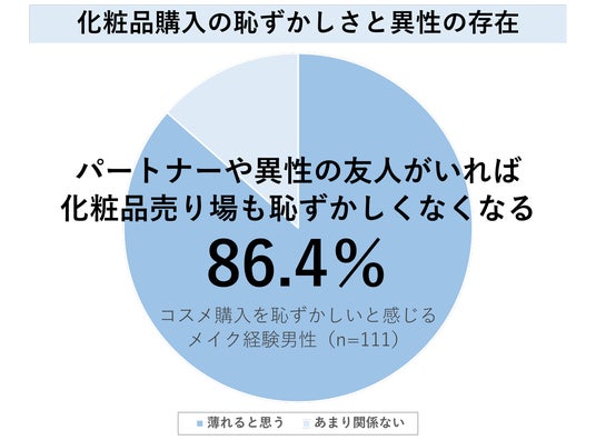 メンズメイクを既に始めている男性において、メイクを始めたきっかけについては、「身だしなみ」や「コンプレックスのカバー」など自発的な目的をもったきっかけのほか、約30%の人が「恋人(パートナー)ができた」「恋人(パートナー)・友達にすすめられた」など周囲からの勧めではじめたと回答しました。また、半数以上が「ひとりで美容関連売り場に行くことが恥ずかしいと感じた」経験があると回答しており、メイクを始めるには、この「気恥ずかしさ」を乗り越える必要があることがわかります。さらに、80%以上が「パートナーや友人と一緒であれば美容関連売り場に行く恥ずかしさが薄れる」と回答するなど、パートナーや友人の存在が大きいことが分かります。